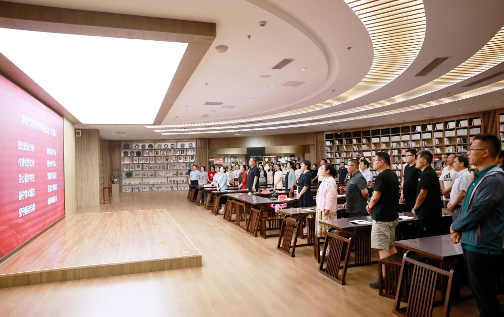 活动最后,何文广指出,两位导师的寄语为青年教师成长提供了立体化的实践范式,全体教师需秉持“学无止境”的探索精神,深入挖掘中华优秀传统教育思想的深邃内涵,在理论浸润与实践淬炼中寻找“立德树人”的最优解。现场全体教师在徐瑞的带领下共读《新时代高校教师职业行为十项准则》,集体参观教育部师德师风建设基地—中国教师博物馆,感悟师德,传承匠心,努力做精于“传道受业解惑”的“经师”和“人师”的统一者。