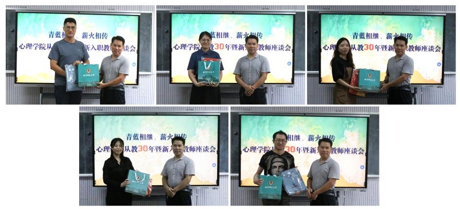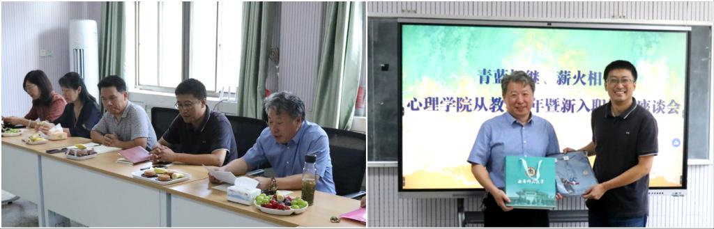 工会主席孙传波主持,党委书记罗文伟,院长何文广,副书记朱伟卫,副院长李海青、王晓明,从教三十年教授魏祥迁和五位新入职教师参与此次会议。