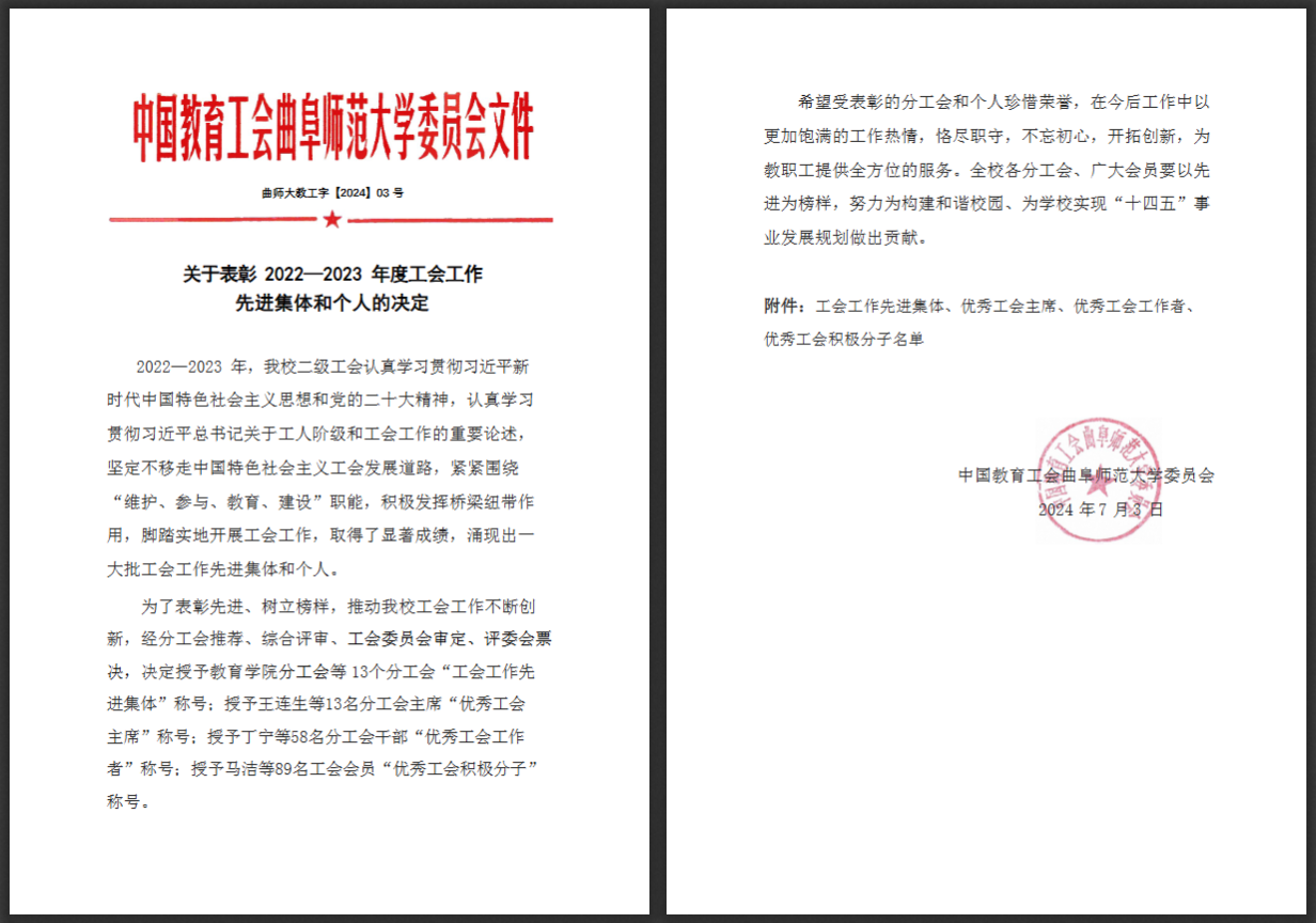 工会公布了2022~2023年度工会工作先进集体和先进个人表彰名单,金沙赌场网站