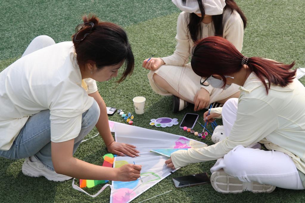 参与活动的同学们或低头沉思,或挥毫泼墨,或精心描绘,每个人都沉浸在风筝DIY的乐趣之中。同时每个小组也分工明确,每个人都认真完成自己的绘制部分。同学之间互相帮助,交流心得,活动现场欢声笑语,热闹非凡。