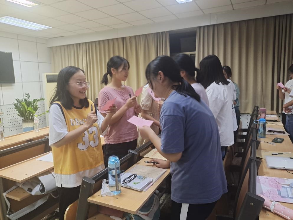 第二阶段,张雯老师通过团体辅导的方式在新生中开展爱校、荣校体验活动,张老师通过带领同学们做手势舞游戏,拉近师生之间距离,形成活跃、和谐的活动氛围。为实现“入耳,入心,学以致用”,加深同学们的记忆和理解,活动伴着“相亲相爱一家人”的优美歌声,同学们也在回忆上一环节讲解员对曲园介绍的同时,在纸片上写下自己对曲园的印象,小组间交流时,大家畅所欲言,与身边的人分享心中的曲园,活动气氛热烈,从各种微表情都可以看出同学们对探索曲园充满热情,对未来美好生活充满期待和憧憬。伴随着“相逢是首歌”的优美音乐,活动渐渐进入了尾声......