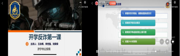 组织全体学生集体观看济宁市开学反诈第一课教育教学活动。在课堂中,济宁市公安局主讲人从什么是电信网络诈骗,电信网络诈骗手段有哪些,如何加强自我防护三个方面,总结了电信诈骗犯罪形式及多发类型,并有针对性的针对学生群体假设了电信诈骗实施手段,以实际案例指导同学们辨别诈骗短信。