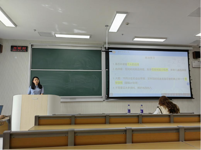 随后,交流会进入经验分享环节。三位优秀的高年级同学先后上台,分享他们的考研经验和心得。首先陈怡分别从政治、英语和专业课学习上的复习规划与备考技巧进行了分享,例如,如何有效记忆知识点、如何调整心态等。她强调了制定合理复习计划的重要性,并建议大家充分利用碎片时间,提高复习效率,师姐中肯的建议使在座的同学们受益匪浅。