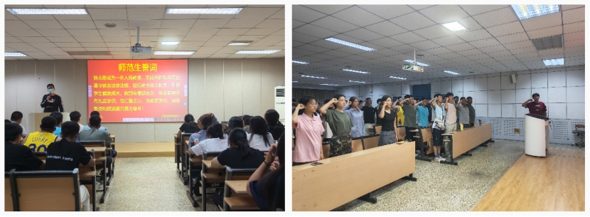 活动伊始,在2024级新生满金宏的带领下,全体新生立正站好,举起右拳,齐声宣读师范生誓词。誓言铿锵有力,承诺掷地有声,回响在教室的每个角落,表达了同学们投身教育的无限热情,履行职责的坚定决心。