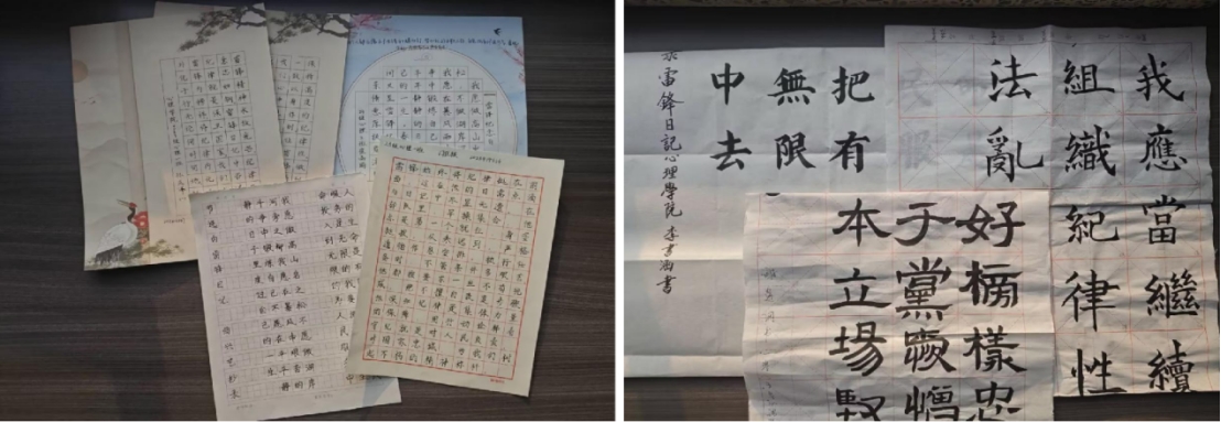活动以雷锋书法、雷锋日记中有关纪律的内容为书写素材,要求作品具有原创性,同时做到紧扣主题、积极向上。比赛分为硬笔、软笔书法两个赛道,涵盖楷书、隶书、行书等多种字体,为同学们提供了多样化的展示平台。比赛期间,参赛选手们通过形式多样、内容丰富的书法作品,充分展现了对雷锋精神与纪律意识的独特理解。硬笔书法作品整齐排列,一笔一划工整有力,一字一句书写着对雷锋精神的传承;软笔书法作品同样出彩,选手们运笔自如,挥毫泼墨展示青春风采。