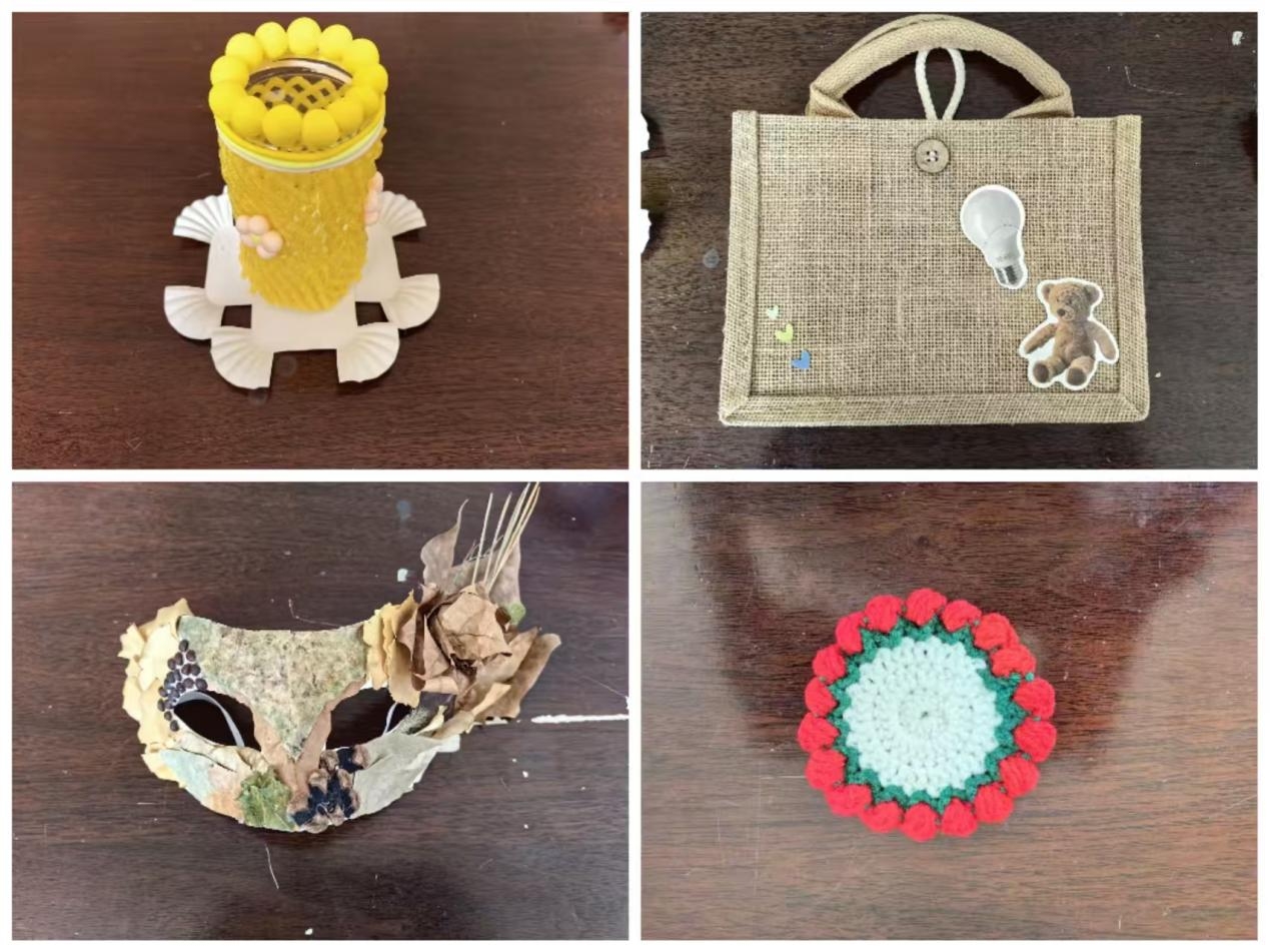 活动中,同学们用自己的智慧与双手,以塑料瓶或者废弃纸袋等旧物为纽带,别出心裁地设计了各式各样地旧物改造作品,并配上了自己的创作理念,作品展现了强烈的创意性、实用性、环保性与艺术性,让废弃物品重新焕发出新的生命力,成为充满艺术感和环保价值地工艺品。同学们用自己的奇思妙想展示了对环保理念的深刻理解和积极践行,充分展现其创新思维和实践能力。