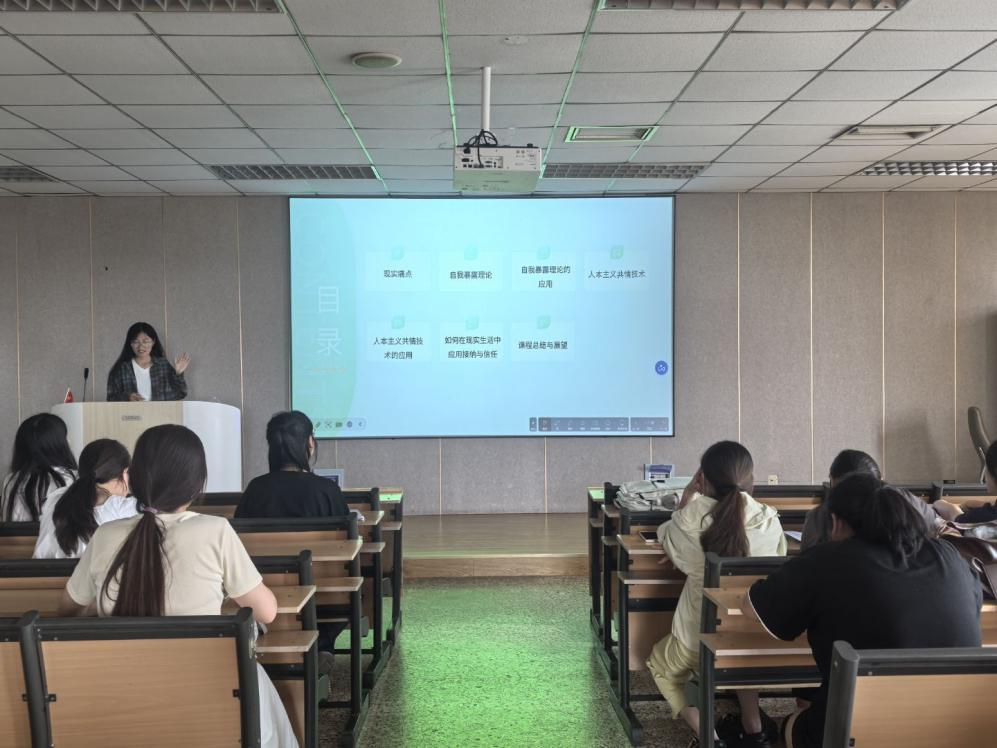 在课堂专题授课部分,朋辈导师赵凤瑶带领大家学习了自我暴露理论和人本主义共情技术的应用,并通过多个形象生动的案例向同学们具体解释了相应的理论,同学们在学习之后积极参与课堂活动,主动分享自己的相关经历,课堂氛围活跃且热烈。