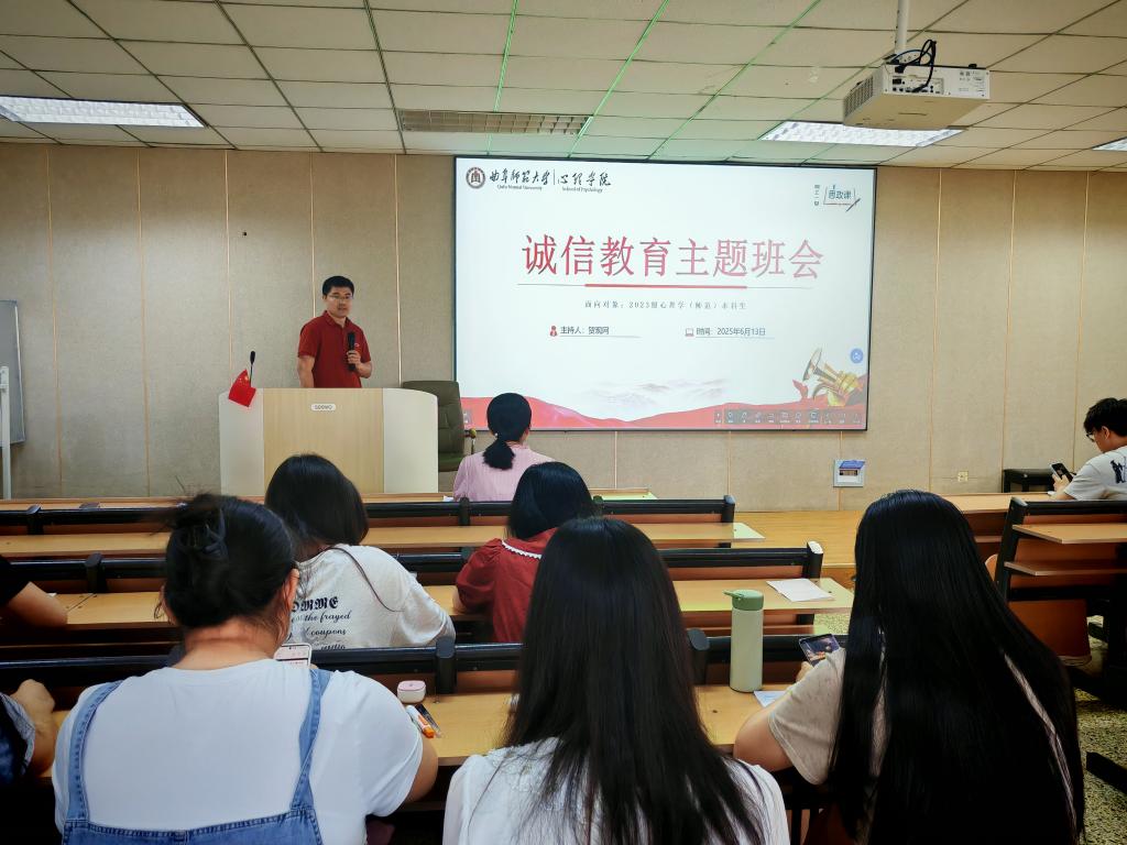 团委书记贺现网主持,全体23级同学参与其中。班会宣讲围绕诚信之本、诚信之脉、失信之痛及诚信之道四大维度,通过引用古今典型事例,生动阐述了诚信的重要性,讲解了诚信教育对同学们的重要意义,不仅着重于即将到来的期末考试,强调诚信应考的重要性,更为同学们未来的人生道路和人格塑造提供了明确的指引。最后主持人总结表示,通过吕超老师的分享,大家全方位理解了诚信的价值,深刻认识到诚信不仅是道德要求,更是人生路上的基石,呼吁同学们以诚信为镜,内化于心、外化于行,成为诚信的倡导者与践行者。