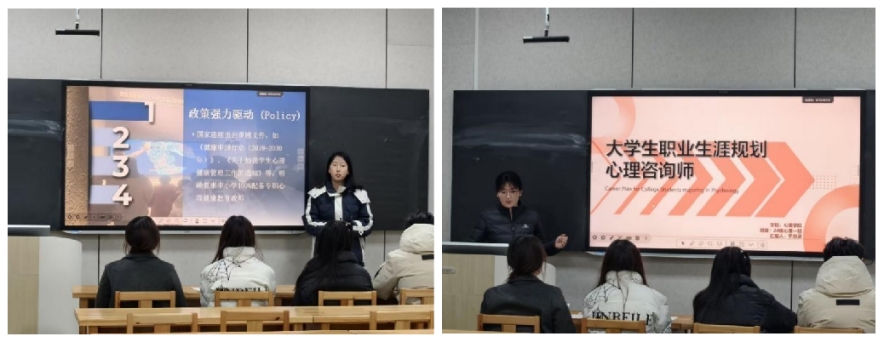 复赛。答辩环节中,12名选手按顺序登台,通过5分钟PPT展示,全面呈现个人职业规划方案,充分彰显出扎实的专业素养与清晰的职业思考。其中,成长赛道选手多以“中小学心理教师”“青少年心理辅导师”为职业目标,方案既包含科学的自我剖析,也制定了明确的阶段性发展计划;就业赛道选手更侧重“实战性”与“岗位适配度”,他们详细分析了目标岗位任职要求,并结合实习经历具象化展示了能力匹配情况,展现出对行业发展趋势的敏锐洞察力和积极适应能力。