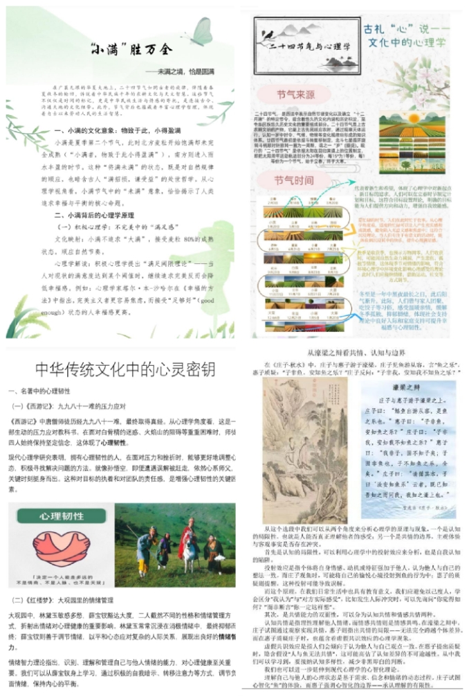通过创作融文字与图像于一体的作品,学生得以在多个维度上锻炼并提升自己的能力。在信息的收集与整合阶段,学生们从浩如烟海的古籍与学术资料中精挑细选,萃取有用之信息;文字表达上,精准阐述古礼心理内涵,提升书面表达能力;图文排版方面,合理搭配图文,增强作品美观度和可读性,提高审美与设计能力。参与活动的过程成为学生探索心理调适方法的契机。在深入探究节气文化的过程中,学生们惊喜地发现,古人早已懂得顺应时节调整生活节奏,以此维持身心之和谐平衡,并从中汲取智慧,学习了诸多情绪调节与压力应对的宝贵技巧。活动形式激发学生学习热情和创新思维。为完成作品,学生主动查阅资料、请教老师,形成良好学习氛围。作品创意频出,如用绘画、书法作品等解读历史典故中的心理现象,以海报展示传统节日心理寓意,展现学生创新能力。