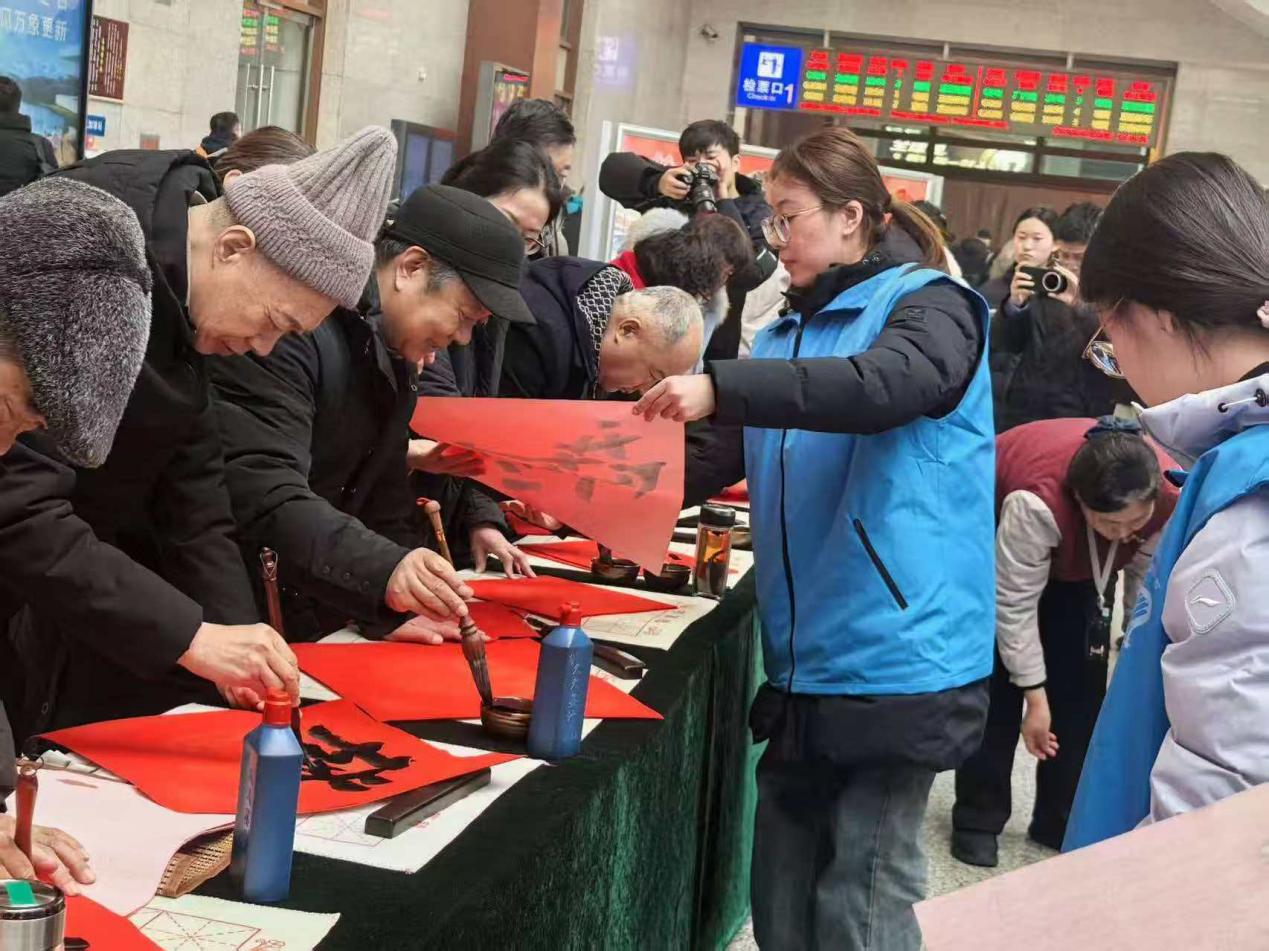 活动当天,实践队员们迅速投入到春运服务。在候车厅的“新春送福”点位,队员们为旅客书写春联与福字,当一幅幅饱含祝福的春联递到旅客手中时,候车厅里洋溢着浓浓的年味,不少旅客停下脚步也参与其中,排队书写属于自己的新春礼物,队员们也借此机会与旅客亲切交流,用轻松的话题缓解他们的旅途疲惫。