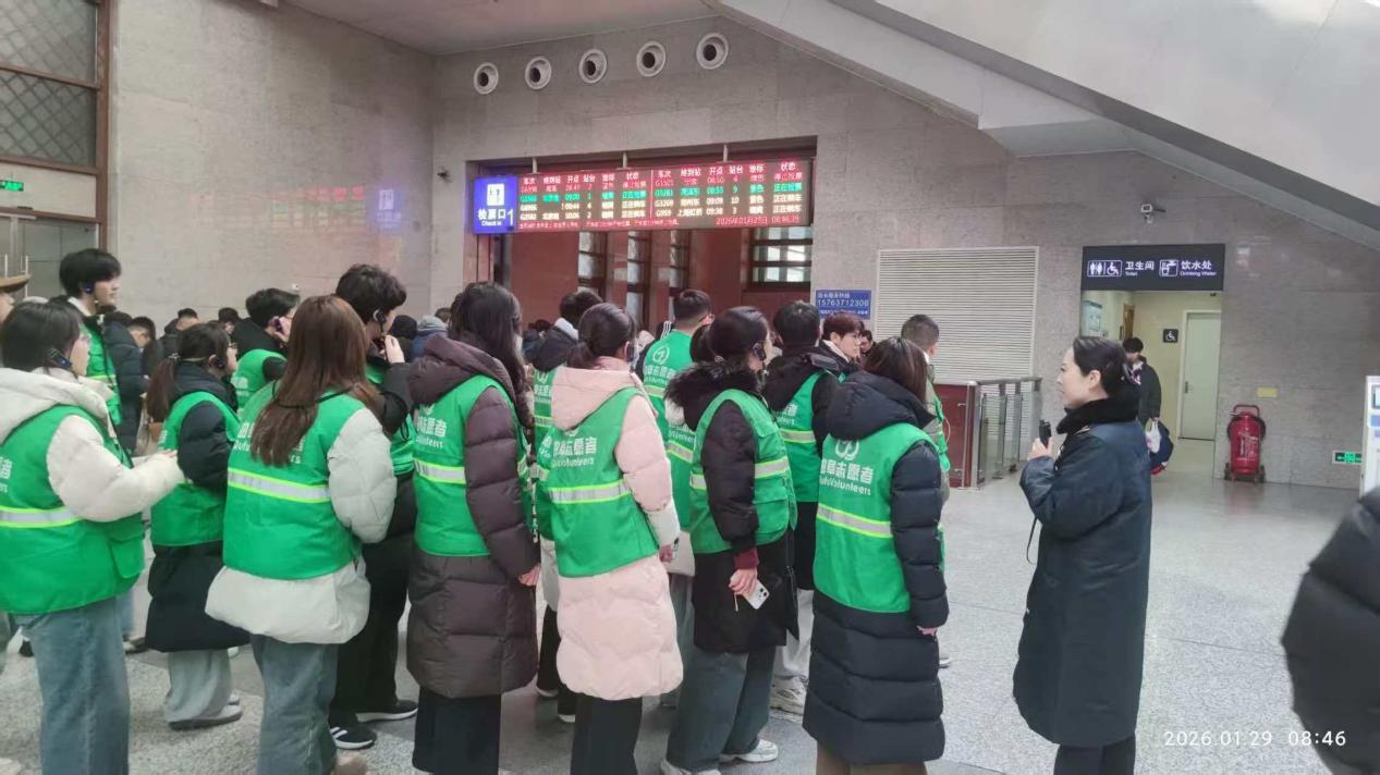“萤火方舟”实践队于2026年1月29日赴曲阜东站开展“情暖旅途·志愿同行”春运志愿服务活动。实践队员们带着专业知识与新春祝福,穿梭在车站的候车厅与安检口,为往来旅客送去暖心服务与心理关怀,用青春力量为春运旅途注入温暖底色。