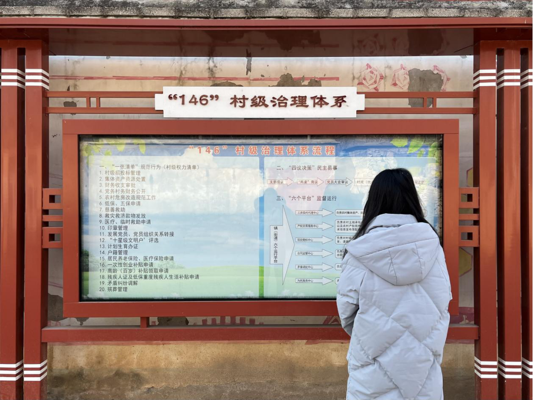 在吉庄村民委员会的政务公开栏上,“146”村级治理体系的示意图引起了实践队员浓厚的兴趣。通过与村干部的深入交流,队员们了解到,这套体系是村级规范化运行的核心框架,旨在通过“制度上墙、权力入笼”实现乡村治理的透明与高效。