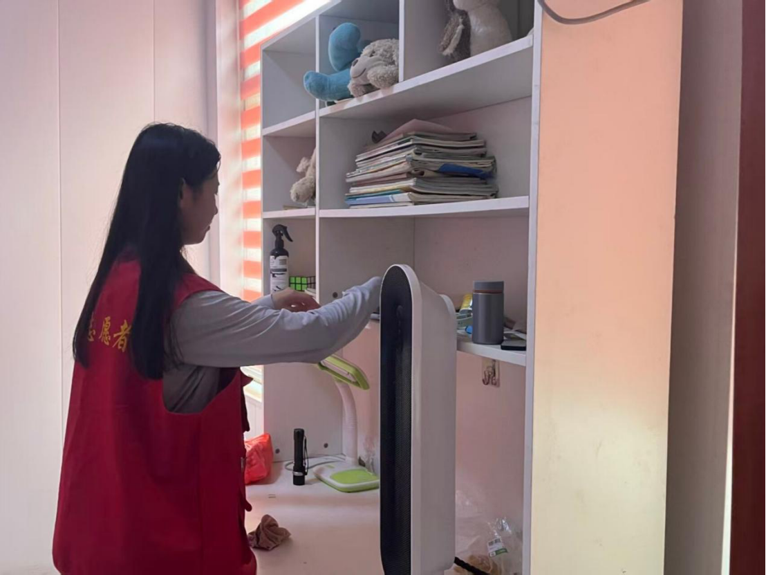 实践队员首先针对社区内部分双职工家庭儿童课后照护与学习环境优化的需求,选择了三户典型家庭开展了入户服务。队员们观察到,由于父母工作繁忙,孩子的学习与活动区域物品堆放较为分散。他们随即进行系统整理:将儿童书籍按绘本、科普读物、教辅材料等类别分类,有序排列于书架;把文具用品统一收纳至笔筒与收纳盒中;对各类玩具进行筛选与归类,毛绒玩具、积木、拼图等分置于不同储物单元。同时,队员们还特别关注居家安全,仔细检查了儿童常用电暖器的线路与表面清洁,确保设备使用安全。经过近两小时的协作整理,孩子的学习角与游戏区变得井井有条,空间利用率与整洁度得到提高。
