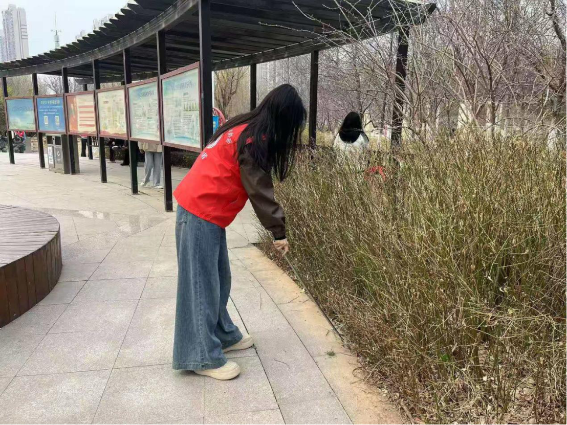 图2“青春聚力兴桑梓,实干笃行焕乡容”实践队员正在使用长柄夹钳清理细小垃圾