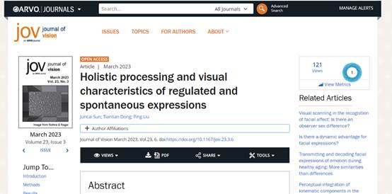 Sun, J*., Dong, T., & Liu, P. (2023). Holistic processing and visual characteristics of regulated and spontaneous expressions. Journal of Vision, 23(3):6, 1–12. //doi.org/10.1167/jov.23.3.6.