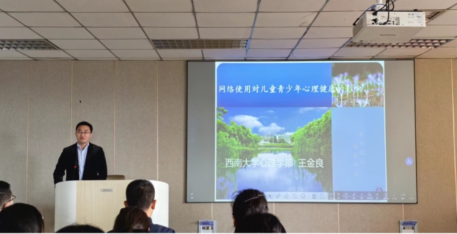报告伊始,何文广院长对王金良教授的莅临表示热烈欢迎,并向各位师生对王金良教授进行了详细地介绍。随后,王金良教授进行了《网络使用对青少年心理健康的影响》的报告。在此次报告中,王金良教授讲述了网络使用对注意力的影响以及发生机制、网络游戏与攻击性的关系以及网络成瘾的成因与应对分析。报告结束后,王金良教授与在场的师生进行互动交流,解答了老师与同学们的疑惑。最后,王晓明副院长对此次报告进行了总结,并强调在进行研究时,我们要将基础研究与应用研究相结合,将理论应用于实际。