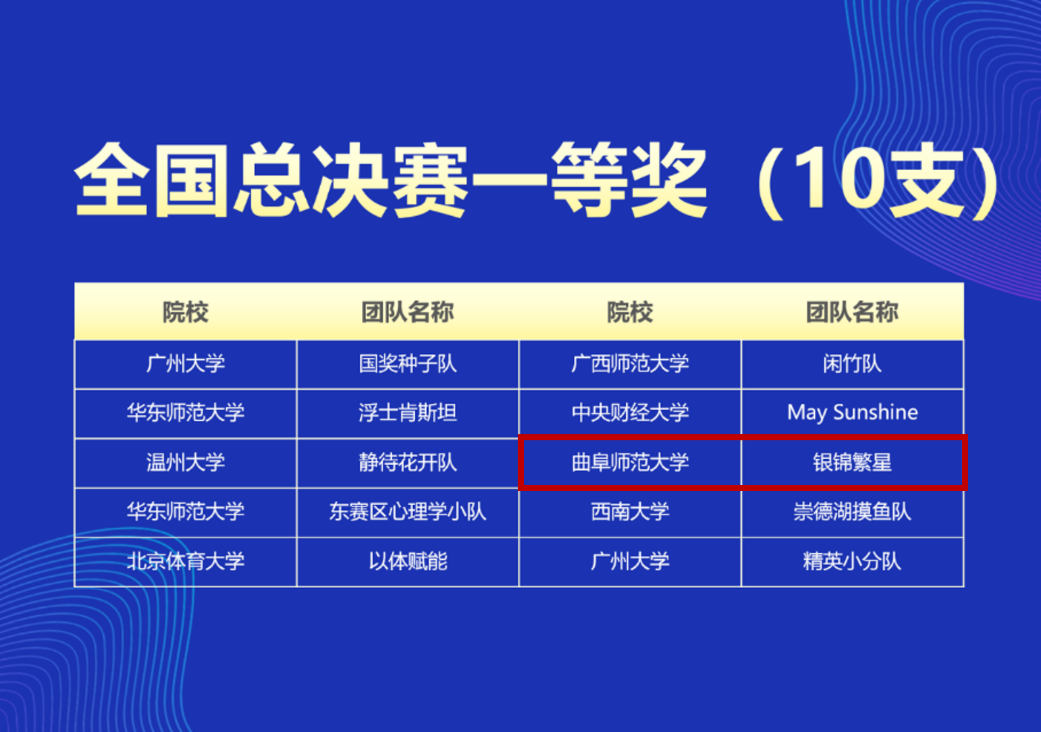 晋级到分赛区竞赛的3支队伍分别获得了分赛区竞赛一等奖1项、三等奖2项。其中,获得分赛区竞赛一等奖的“银锦繁星”团队成功晋级全国总决赛,与全国总决赛中的其他52支队伍进行激烈角逐,最终在“自选赛道”的31支队伍中脱颖而出,获得全国总决赛一等奖。同时,金沙赌场网站